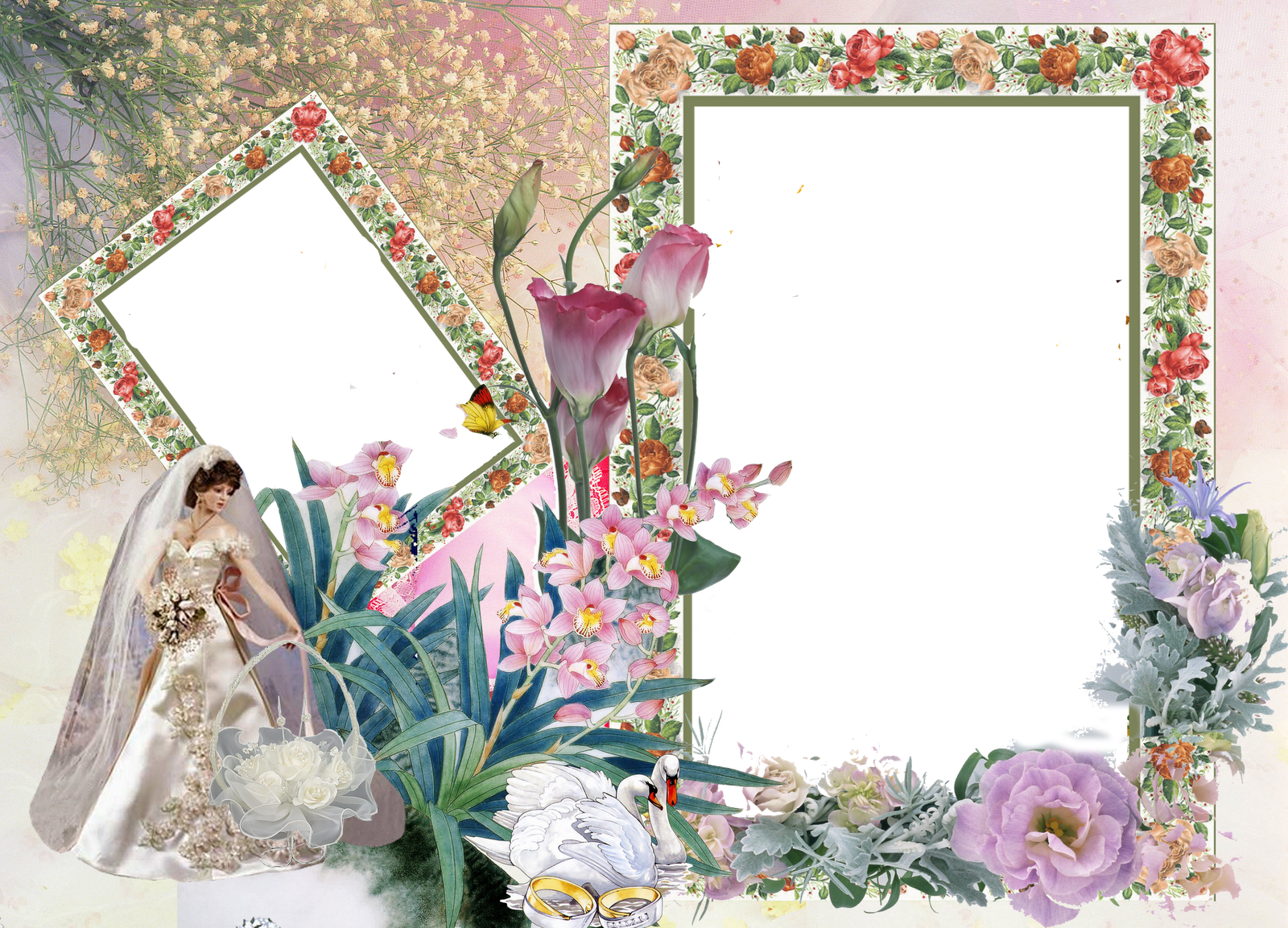 Нежные розочки украшают png рамку для фотографии, на которую присела желтая бабочка, расправив крылышки. Очаровательный коллаж с цветами роз, белым цветочно-лиственным ободком и милой светло-желтой бабочкой для снимка возлюбленной.